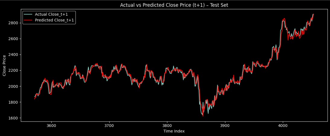 Forecasted TCS stock's next-day closing price using a hybrid LSTM + Dense model and optimized Random Forest for multi-day predictions with up to 97.5% R² accuracy.