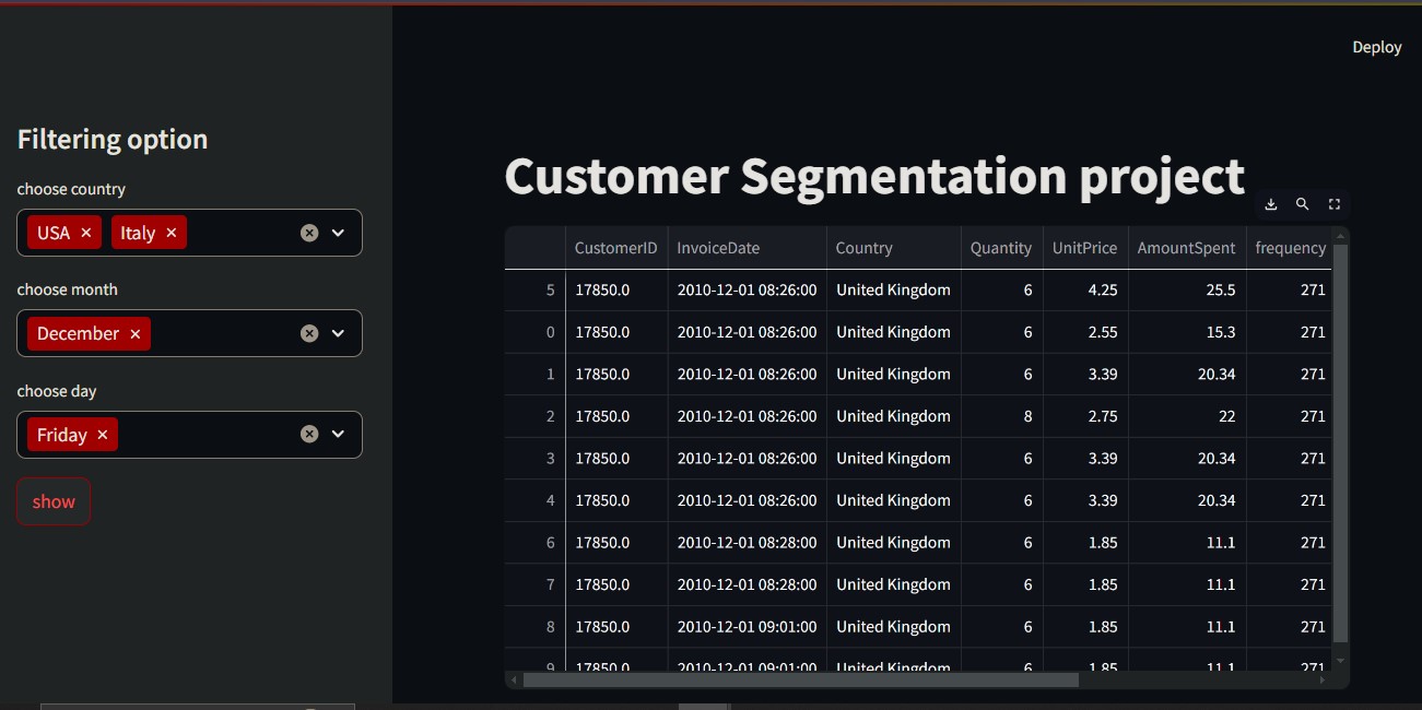 Streamlit dashboard with K-Means (5 clusters) for retail segmentation, interactive filters, and visualizations. Uses StandardScaler and Seaborn/Matplotlib.